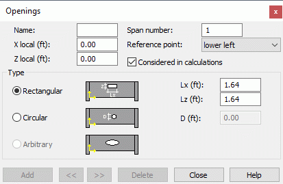 Once all the required parameters are defined, pressing the ADD button results in the acceptance of the defined opening and saving of the data. The buttons: << and >> located in the Openings dialog box allow to move about the table containing the data pertaining to all the defined openings.