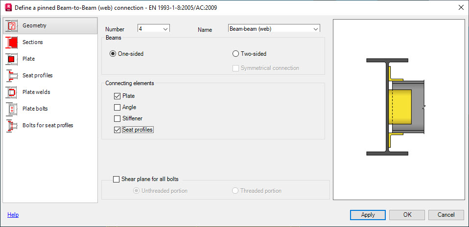 Note: The number of tabs in this dialog depends on the selected type of connecting elements, additional stiffening elements and connection type: welded or bolted.