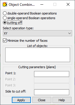 The option lets you determine the parts of the surfaces of the selected objects that are located on one side of a defined plane. The operation yields an object cut-off from the selected objects using a defined plane. Specify the direction in which the selected objects will be cut off in the Side to cut off box.