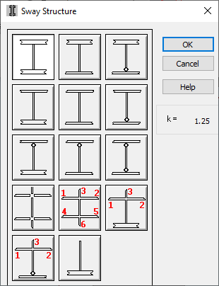 The dialog box shown below allows for the selection of the buckling model for sway structures (analogous dialog box is opened for non-sway structures). It is active once the sway structure option (for Y or Z direction) is selected in the Column Buckling Model Selection dialog box and the icon corresponding to the buckling model is pressed.