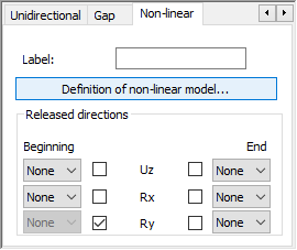 Clicking Definition of non-linear model opens the dialog for defining a curve that determines the non-linear character of the release. Curves defined in the Non-linear Model Definition dialog are visible on the selection lists in the dialog. The non-linear behavior of the release is defined by selecting for a given degree of freedom, one of the following relations: force-displacement or moment-rotation. You can select the model after the appropriate direction is released, at the beginning or the end of a bar.