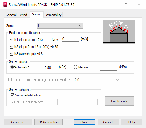 Opening the Snow/Wind Load dialog and clicking the Snow tab displays the following dialog.