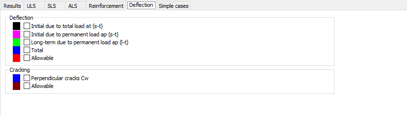 For the codes: ACI 318 and ACI 318 metric, the dialog box provides options that allow displaying - on a diagram - admissible and total deflections as well as intermediate stages of deflections compatible with the required code calculations.