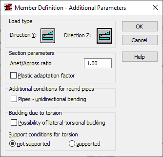 - Lateral torsional buckling; determine if such buckling type will be taken into consideration and what the conditions of support against torsion are to be (fixed or pinned member).