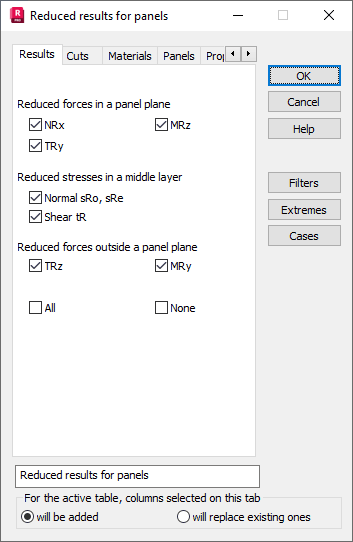 Select the Results tab in the Columns dialog to select quantities for presentation.