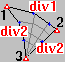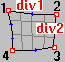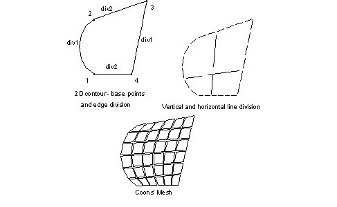 After the contour is selected and a panel shape is determined, you define the parameters of Coons' method (see Job Preferences > Meshing Options) as well as the division parameters. The division parameters (division1 and division 2) describe the number of elements that will be created on the first contour edge (between the first and the second contour corner) and the second contour edge (between the second and third contour corner). The number of corners you define depends on the selected contour shape. The contour edges opposite the edges with defined divisions will be divided automatically, so that the division corresponds to the defined division. For triangular contours, the edge division between the first and third contour corners is the same as that between the second and third corners. For quadrilateral contours, the division between the third and fourth contour corners is the same as that between the first and second corners. The division between the first and fourth corners is the same as that between the second and third corners, as shown.