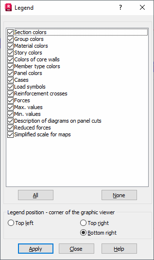 - Colors of sections, groups, materials, stories, bar types, and panels - When selected, Robot presents a list of colors assigned to the elements being displayed, such as sections, materials, stories, bars, and panels.