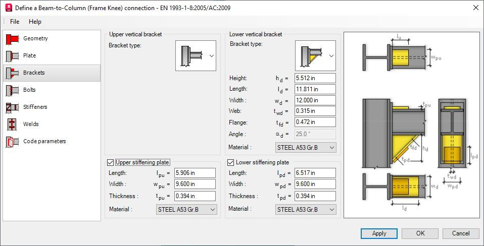 Use the Brackets tab to define different types of brackets between the beam flanges and the front plate.