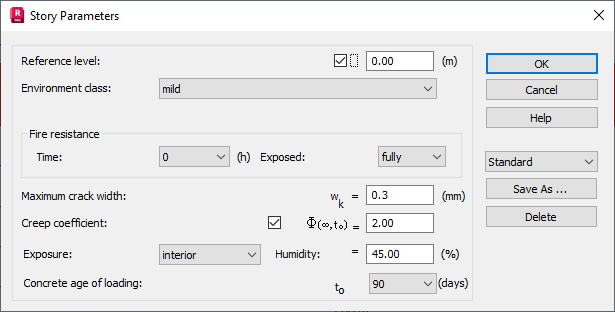 The Story Parameters dialog allows you to define parameters of a story according to the British (BS 8110) code.