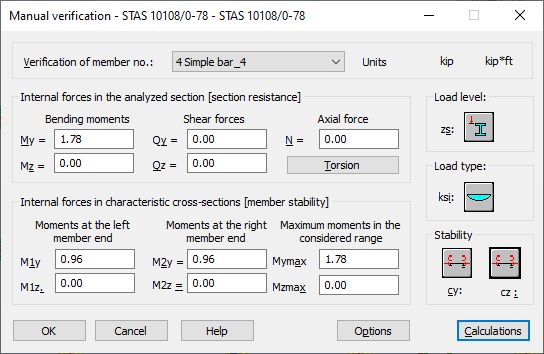 Note: In calculations run in the Manual verificationdialog box internal bracings defined in the Member definitiondialog box are not taken into account and a member is treated as the one without bracings over its length.