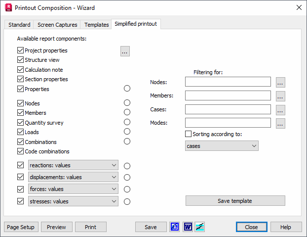 If the third possibility is selected, the radio buttons () can be selected. These may be included in the simplified printout. If an element or quality is included in user defined simplified printout, the appropriate button is activated and relevant edit fields are available to define lists of nodes, bars, cases or modes.
