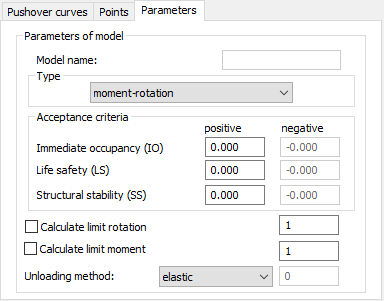 After selecting the Parameters tab in the Definition of non-linear hinge model dialog, the following dialog displays.