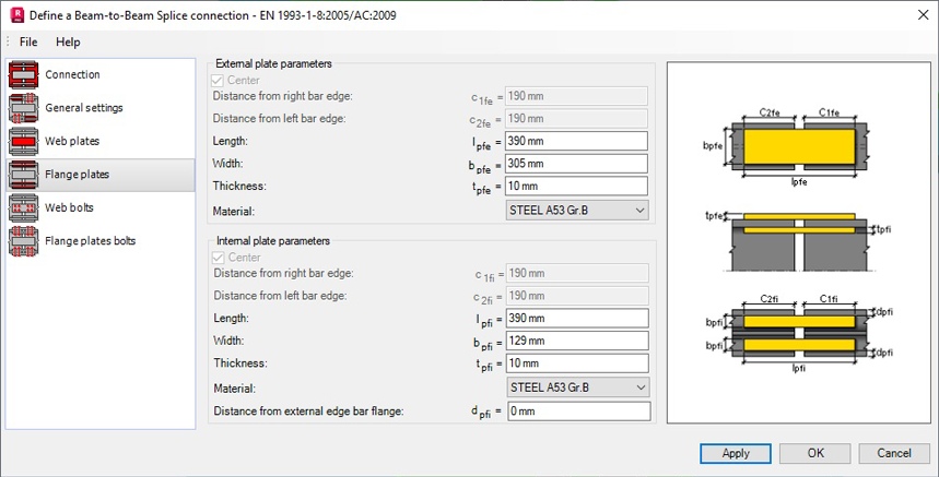 Note: If the connection is not symmetrical the Flange plates panel is divided in two panels: