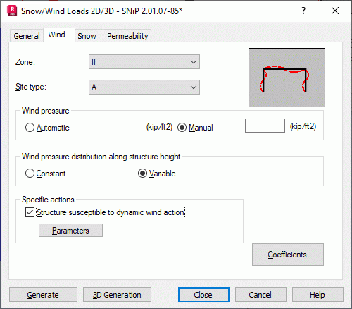 - Manual - Specifies basic wind pressure manually. When specifying values manually, Robot does not account for parameters such as: Zone or Site type.