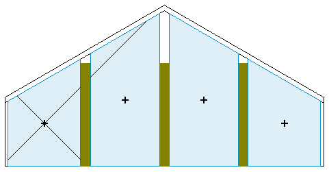 For example, if a partial wall or architectural column that does not reach the ceiling or roof is defined as room-bounding, Revit does not include the space above the element in the room volume. In the following section view, the green columns do not reach the roof, and the white space above them indicates space that Revit omits from the room volume computation.