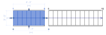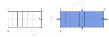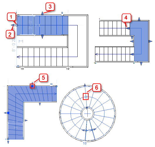 | 1 | Drag the filled dot control (at the open run end) to reposition the end of the run and to add or remove treads/risers in any direction. (You cannot add treads/risers below the base level of the stair.) |