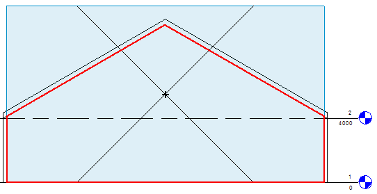 For rooms under roofs, such as attic spaces, specify an upper boundary that is greater than the height of the roof. This strategy ensures that the volume is computed up to the roof pitch. For example, the following section view shows a room that starts at Level 1 and extends 7000 mm above Level 2 (indicated in blue). When computing the room volume, however, Revit uses the intervening roof as the upper boundary for the room (indicated in red).