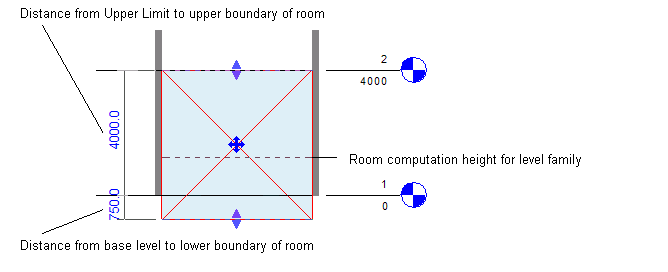 Revit displays listening dimensions to indicate the distance of the upper and lower boundaries from the upper limit and base level of the room. You can enter a value directly, if desired. See Use listening dimensions.