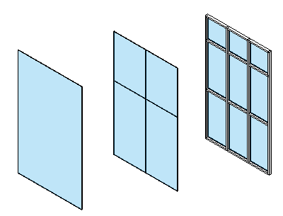 In common usage, curtain walls are often defined as thin, usually aluminum-framed walls containing in-fills of glass, metal panels, or thin stone. When you draw the curtain wall, a single panel is extended the length of the wall. If you create a curtain wall that has automatic curtain grids, the wall is subdivided into several panels.