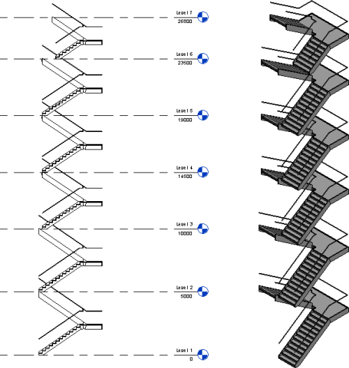 Create a multistory stair from a stair by selecting the building levels. Multistory stairs automatically adjust if level heights change.