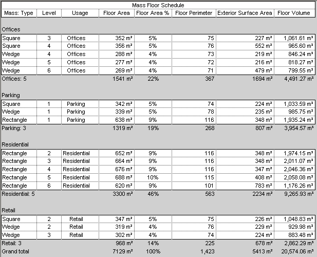 After creating mass floors, create a mass floor schedule to assign usages or to analyze the design.
