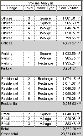 The schedule shows the volume of each mass floor, volume subtotals by usage, and a grand total for the combined volumes of the mass floors. Use this information to estimate HVAC loads for the design based on the planned usage for each mass floor.