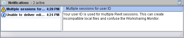 In Worksharing Monitor, an active notification informs you of a current issue that impacts (or may impact) your work in Revit.