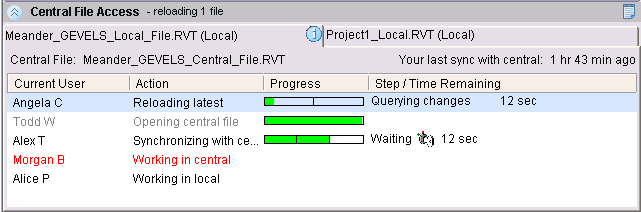The tab displays one line for each project user. Your information line is highlighted. If you are working with a local copy of the project file, the top of the tab indicates how long ago you saved changes to the central file. Red text indicates that someone is working in the central file.