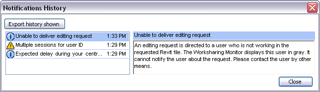 In Worksharing Monitor, the Notifications pane lists only active notifications, that is, issues that have not yet been resolved. When an issue is resolved, its notification is moved to the Notifications history.