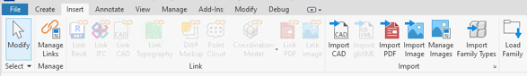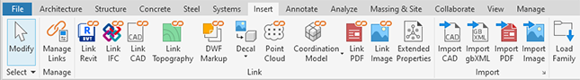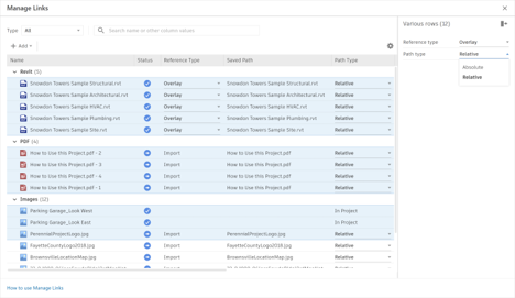 The Manage Links dialog shows all CAD formats for linked files, and only the imported DWG, DXF, DGN, SKP, AXM CAD formats for both projects and families.