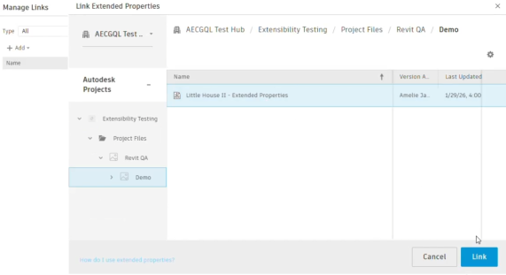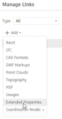 Click Extended Properties to access properties created outside of Revit. In the Link Extended Properties dialog, you can link a model and access extended properties.