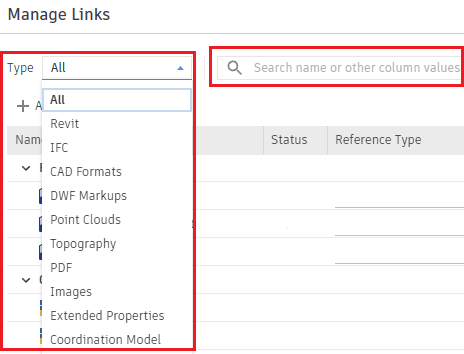 In the dialog, use the filter to show each type, and the Search function to find links.