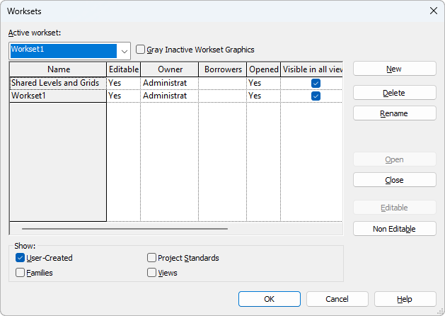 The following image shows the Worksets dialog, with the two default user-created worksets, Shared Levels and Grids and Workset1.