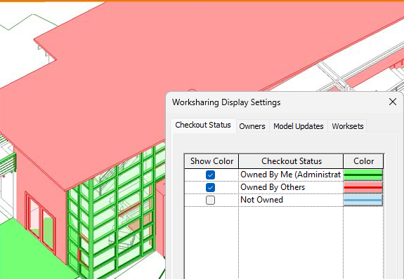 You can visually distinguish workshared element checkout status. Apply color to elements that are owned by any team members.