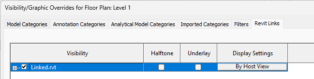To specify that a filter and other graphic overrides applied to a view of the host model should also apply to linked models and nested models in the view, use the By Host View setting (the default).