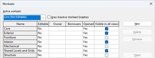 This global setting defines the default behavior for each workset in project views. You can override the visibility of each workset for individual views.