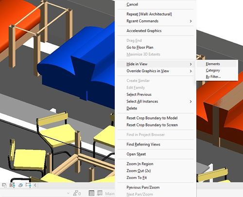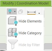 - You can instantly hide or unhide elements or categories of elements using the contextual menu directly in the Revit canvas. Select Hide in View from the right-click menu, then select Elements or Category. Alternatively, you can select Hide Elements or Hide Category from the drop-down menu placed in the Modify | Coordination Model tab. This increases efficiency by displaying only the relevant details and avoiding information overload through selective element visibility. This functionality applies to coordination models linked from