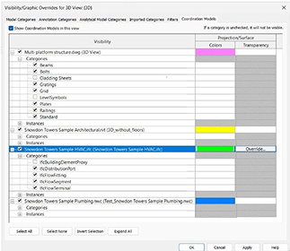 - You can easily manage the visibility of the coordination models categories from the Visibility/Graphic settings. Categories of elements for coordination models linked from