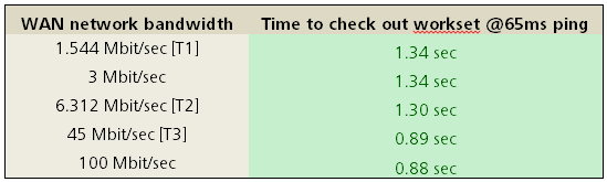 If the volume of data being moved across the network is small, bandwidth requirements are very modest. In this example, we check out a workset containing about 18,000 elements. (The number of elements actually has little bearing on the time required to complete the operation.) Note that the time required to complete the operation does not change substantially as available bandwidth increases: although data is being accessed across the WAN, the amount of data being transferred is very small. Other operations with a comparably light network footprint (such as borrowing or relinquishing an element) behave in a similar fashion.