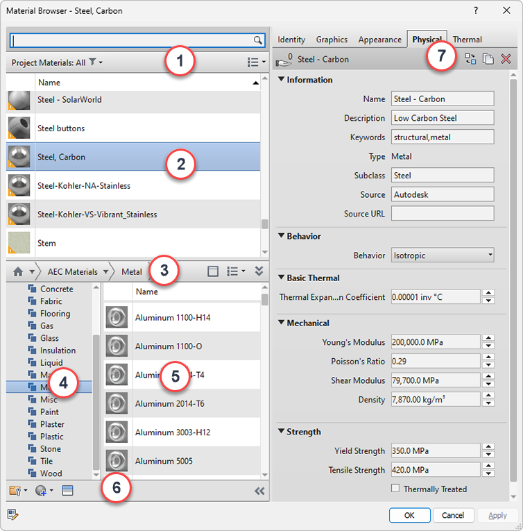 | 6 | Material Browser Toolbar: Provides controls to manage libraries, create new or duplicate existing materials, or open and close the Asset Browser. |