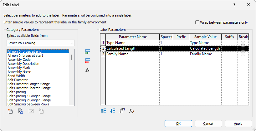 The Category Parameters window contains the label parameters related to the tag type. The Label Parameters window contains the Category Parameters that display in the label. Typically, this is a single parameter, but you can detail more complex, concatenated labels.