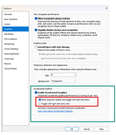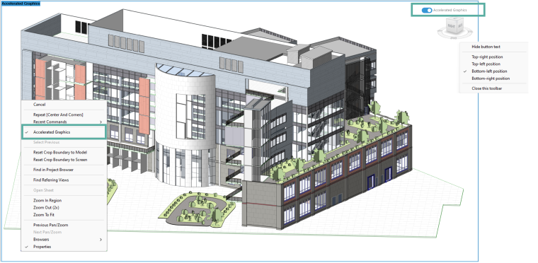 - Show onscreen toolbar and toggle with right-click menu—both the onscreen toolbar and right-click options are available to enable and disable accelerated graphics in a view