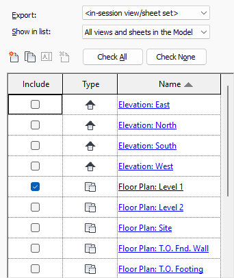 When exporting a model to various formats, use tools on the Export dialog to select the views and sheets to include. Save the selected set for later re-use.