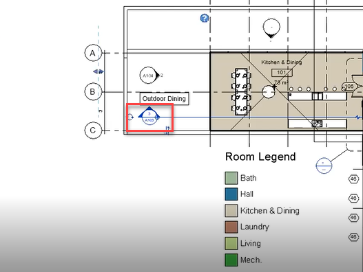 In the image below, the view scale for section tags is set to 1:200. The "Hide at scales coarser than" variable is still set to 1:100. Notice how the section tag is no longer visible because the view scale for the section tag is greater than the threshold set by the Hide at Scales Coarser Than parameter.