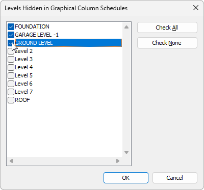 Note: In order for a level to be displayed in the Graphical Column Schedule, it must be left unchecked, and be within the Top/Bottom Level constraints of the Graphical Column Schedule view. For more information on Top/Bottom Level constraints, see