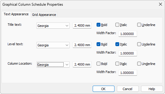 Change the formatting for the three text styles in the schedule: Title, Level, and Column Location and click OK.