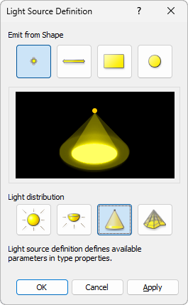 - For Emit from Shape, select the shape of the light to emit from the light source: Point, Line, Rectangle, or Circle.