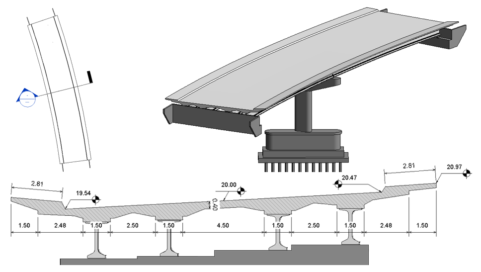 When an element intersects the cut plane of a view and is not perpendicular to that view, you can place dimensions to edges and points in the same way you would to elements perpendicular to the cut plane of the view. As shown in the bridge deck example below, dimensions are placed on the edges and points where they intersect the cut plane of the view.