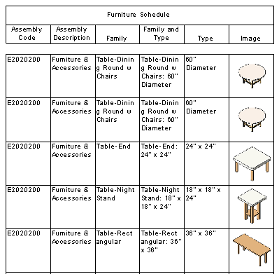 Images that you can associate with an element include images you import into the model and images that you create by saving views of the model (such as 3D or rendering views) to the project. If included in the schedule definition, the images display in the schedule viewport that is placed on a sheet. The schedule view itself includes the image name, but not the image. The following example shows a furniture schedule with images on a sheet view.