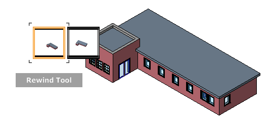 The rewind tool is available on all SteeringWheels. As you use the navigation tools to reorient the view of a model, the previous view is saved to the navigation history. The navigation history holds a representation of the previous views of the model, along with a thumbnail. A separate navigation history is maintained for each window; it is not maintained after the window is closed. Rewind navigation history is view-specific.